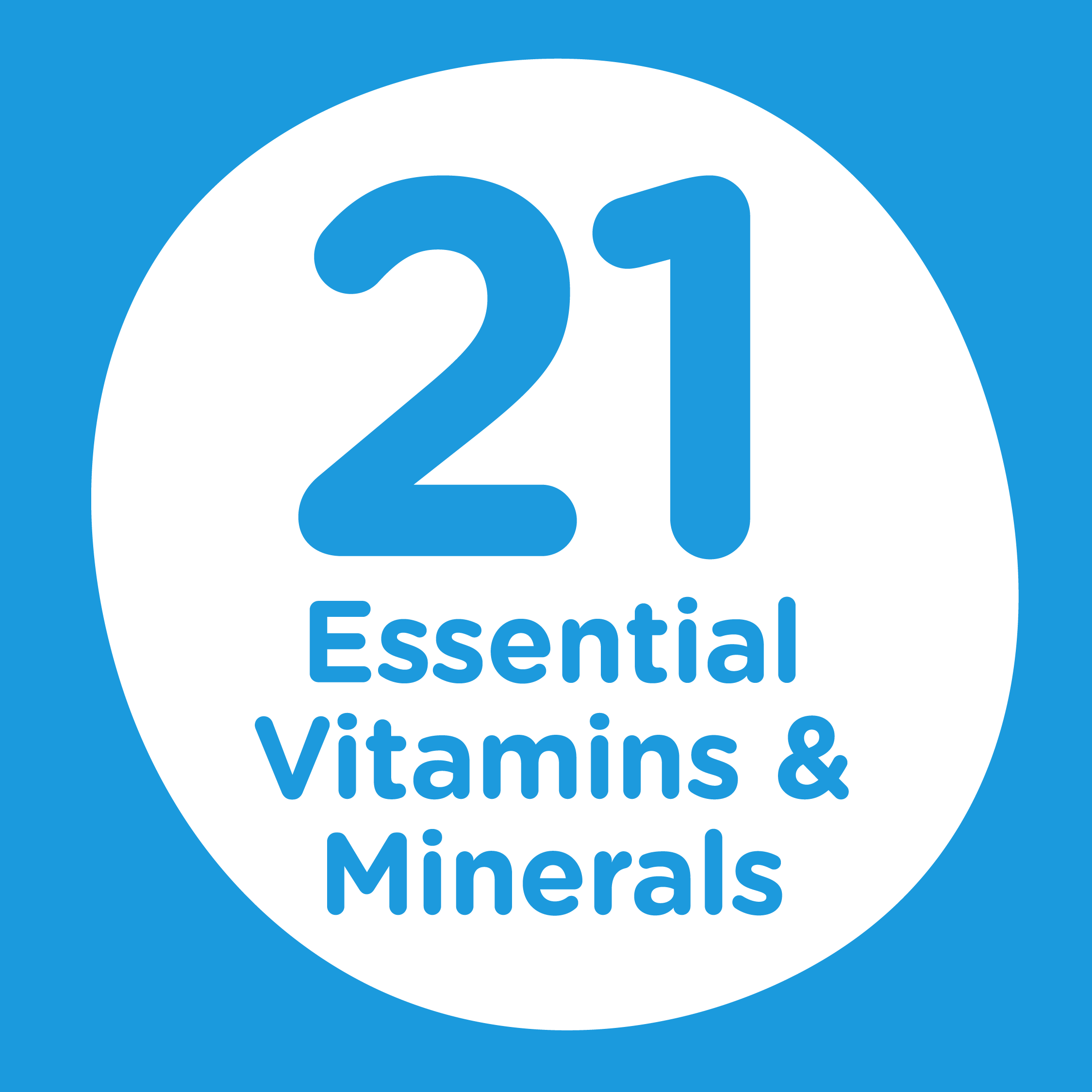 21 vitamins and minerals, Choline, Omega-3, Fiber, and a full B-Vitamin complex are specified at % Daily Value levels appropriate for young children.
